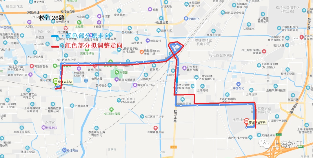 由松江火车站起经人民南路、中山路、松卫北路、香亭路、荣福路、泖亭路、香泾路至香泾路。