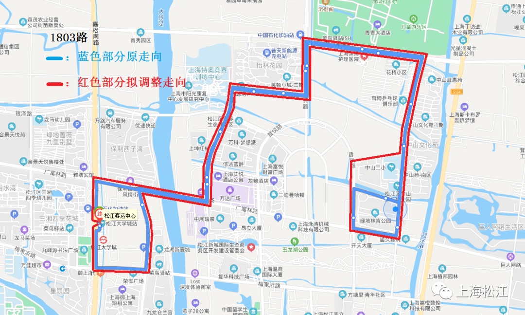 由松江火车站起经人民南路、中山路、松卫北路、泖亭路、香泾路至香泾路。