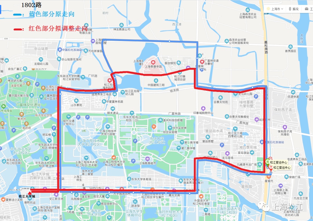 (下行)自松江大学城起经文汇路、人民北路、梅家浜路、嘉松南路、银泽路、人民北路、广轩路、龙腾路、银泽路、龙源路、文汇路至松江大学城。