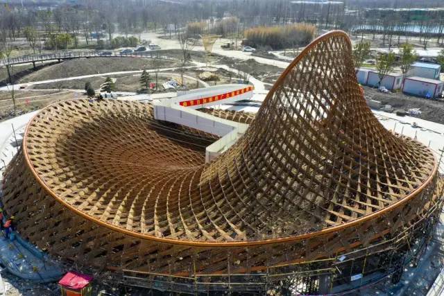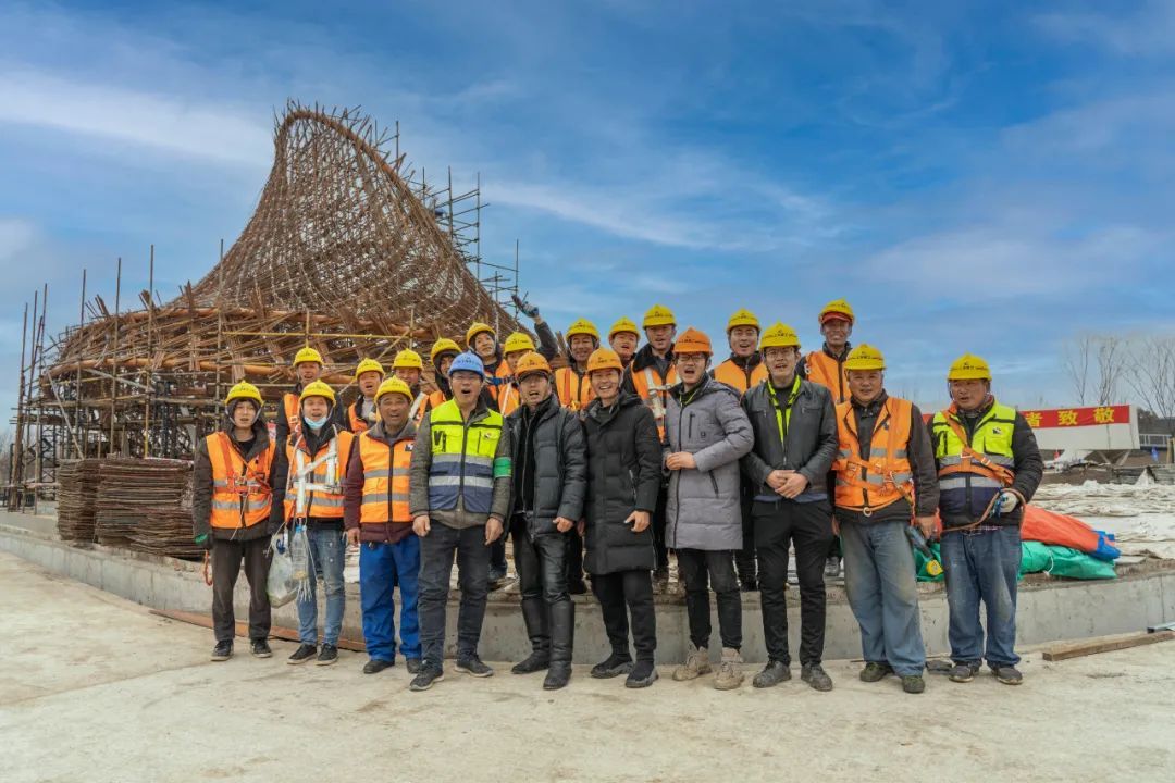 建造实施过程中,总长度近万米的竹钢片为全手工“编织”安装,施工人员从春节开始,无休奋战了100天编织了10000米。通过建筑师、结构设计师、工艺师、施工人员全力合作,这个“非常规定制”的编织曲面终于落成,不仅展现了张拉索网的结构美感,还显示出新型绿色竹材在当代建筑中的创新应用。