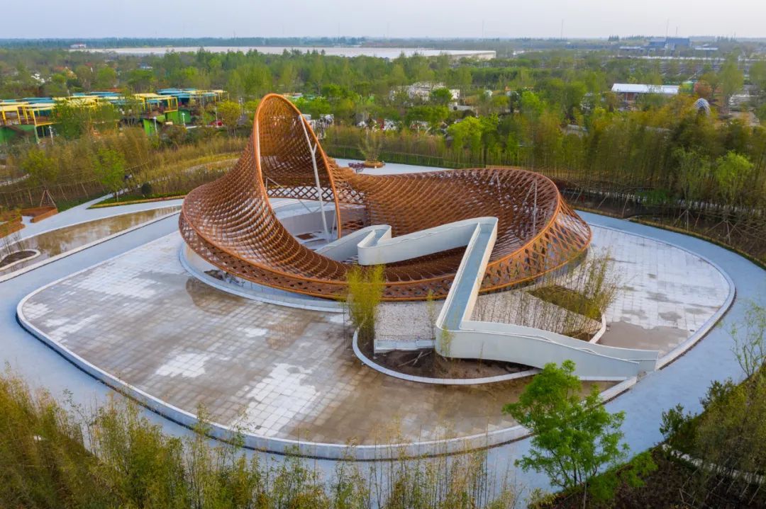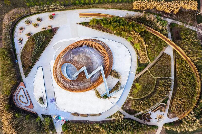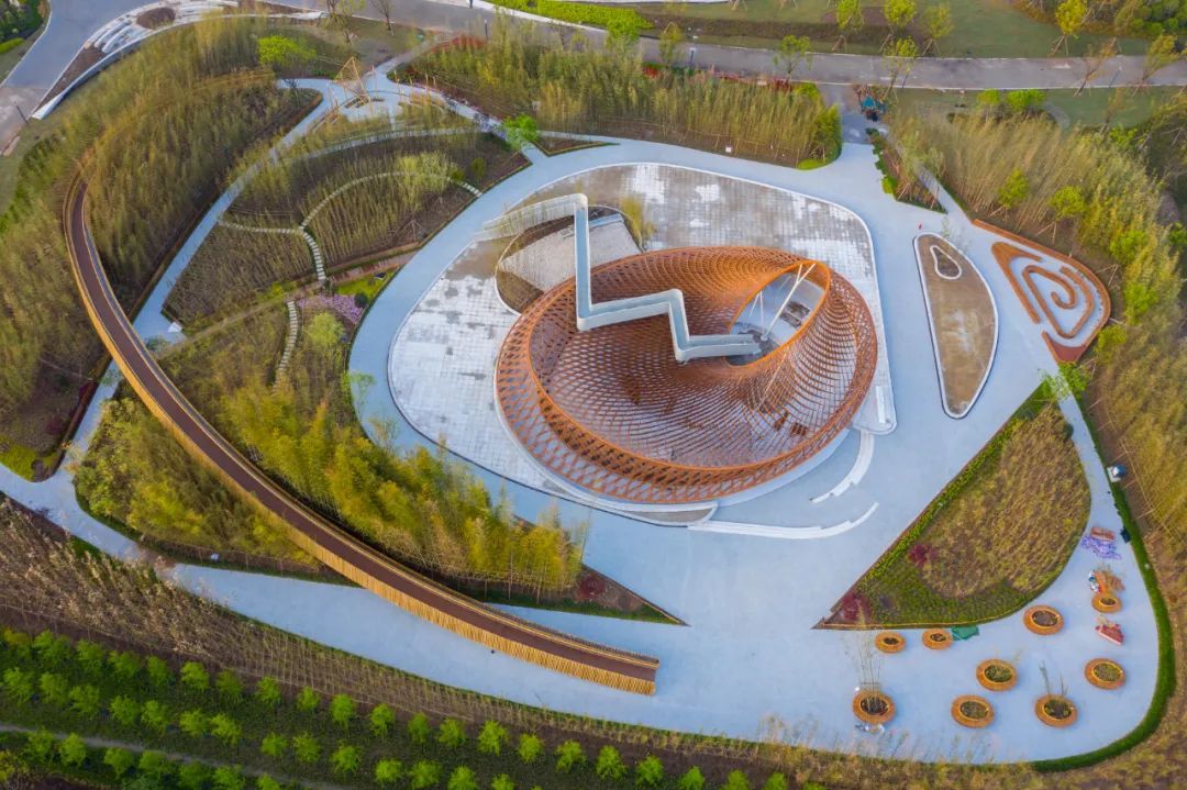 结合花博会主题,竹藤馆以“茧”为原型,取“破茧为蝶”之意,拟编织层叠之形,塑造出一个竹茧般的“非常规”建筑形态。从高空俯瞰,竹藤馆宛如一只竹藤编织而成的“茧”。
