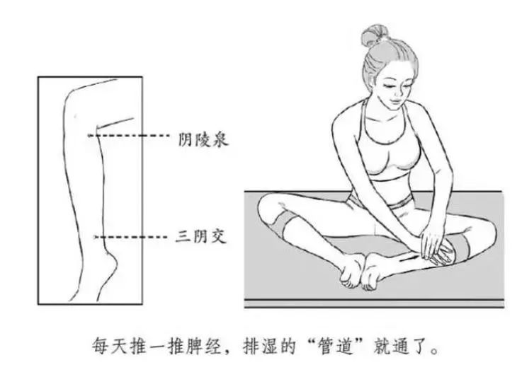如果在推小腿脾经的过程中发现痛点正好压在脾经上,那一定要多揉小腿脾经才真正管用,也就是找到小腿脾经上的阴陵泉穴、地机穴、漏谷穴、三阴交穴这4个穴位上去推。