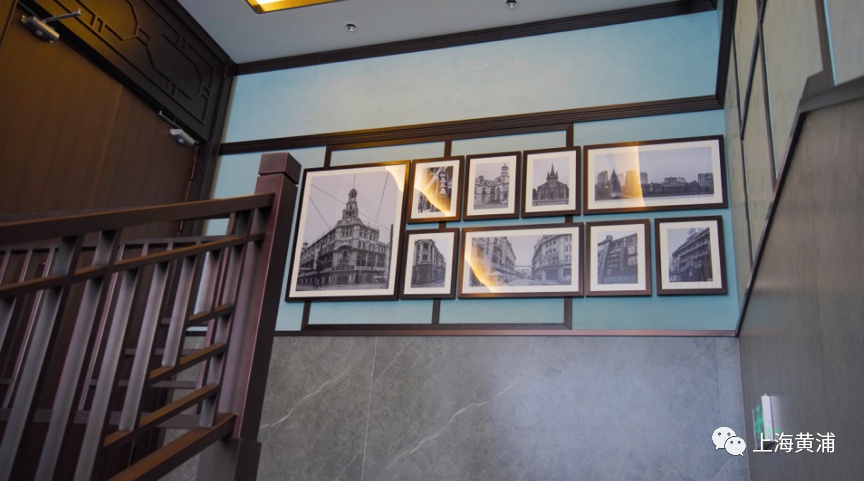 通往二楼的楼梯上悬挂着上海滩老照片