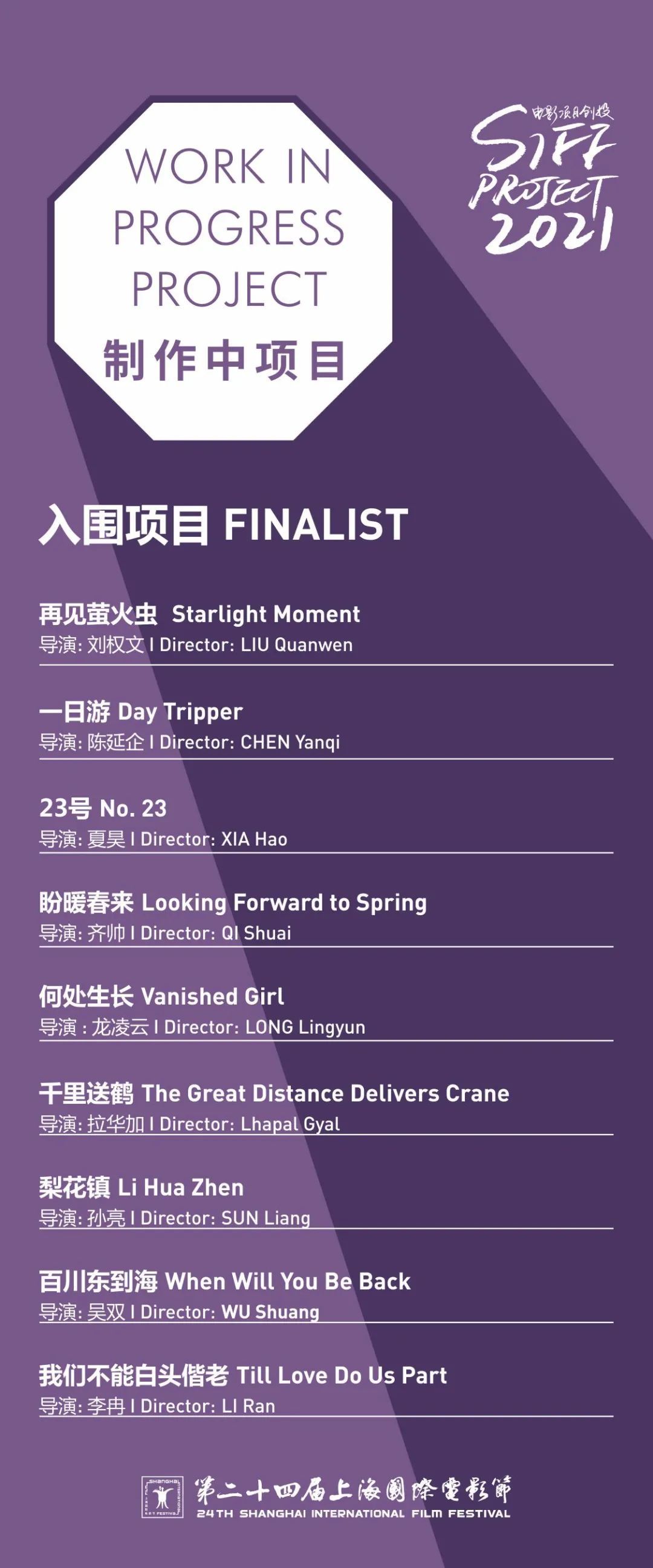 第二十四届上海国际电影节·电影项目创投(SIFF PROJECT)将于2021年6月12日至15日举行,现正式公布“制作中项目”(Work in Progress Project)单元入围名单。