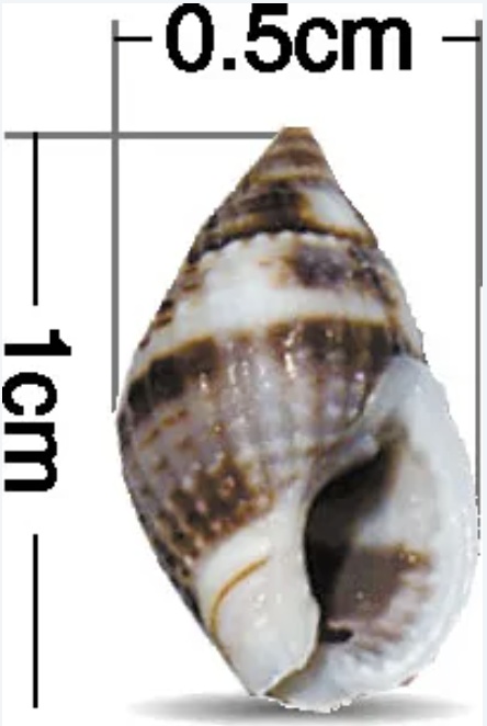 外形特征表现为尾部较尖,细长,一般长度约为1厘米左右、宽度约为0.5厘米,螺壳面常具有1-3条紫褐色或红黄色螺带,肉体为淡黄色。