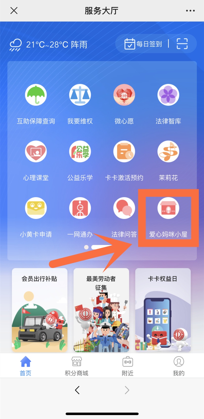①点击【申工社-服务大厅-爱心妈咪小屋】