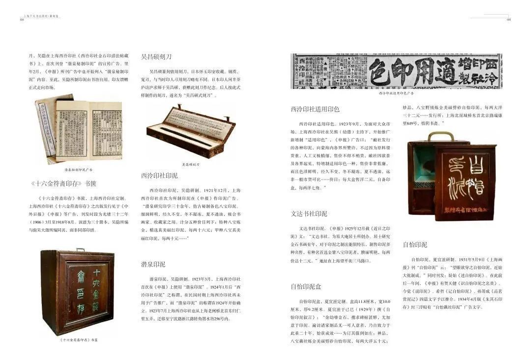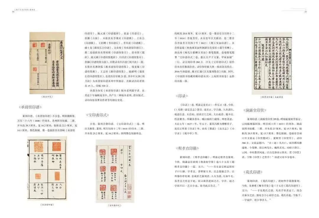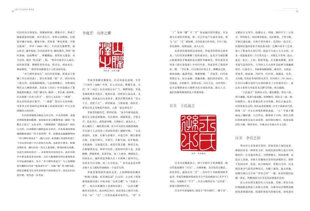 进入民国以后,扫叶山房以旧谱重版石印的形式,陆续出版了《小石山房印谱》《学山堂印存》《谷园印谱》《历朝史印》《集古印谱》等。商务印书馆、有正书局、神州国光社等也都陆续开展印谱出版的业务。最为值得称道的还是上海西泠印社的印谱出版,经过两代人的积累,不仅在出版数量上无人可比,而且在制作方式上也别具特色,大量使用的锌版钤印墨拓技术,使得印谱的出版在质量和成本上找到了最佳结合点。