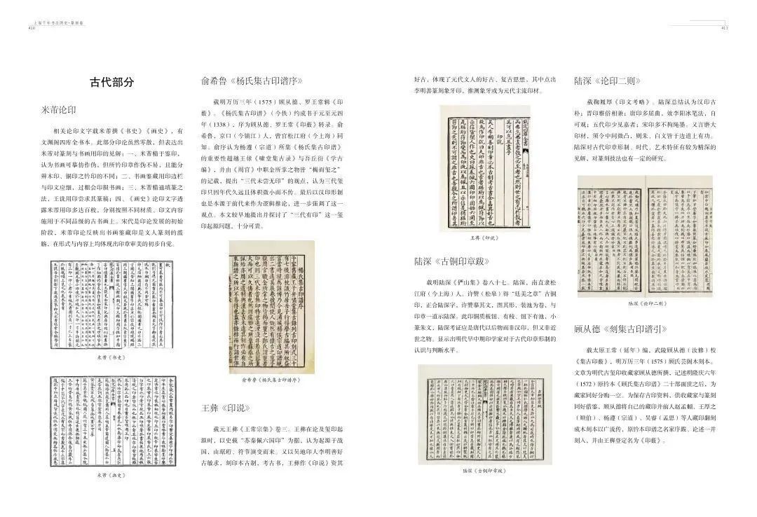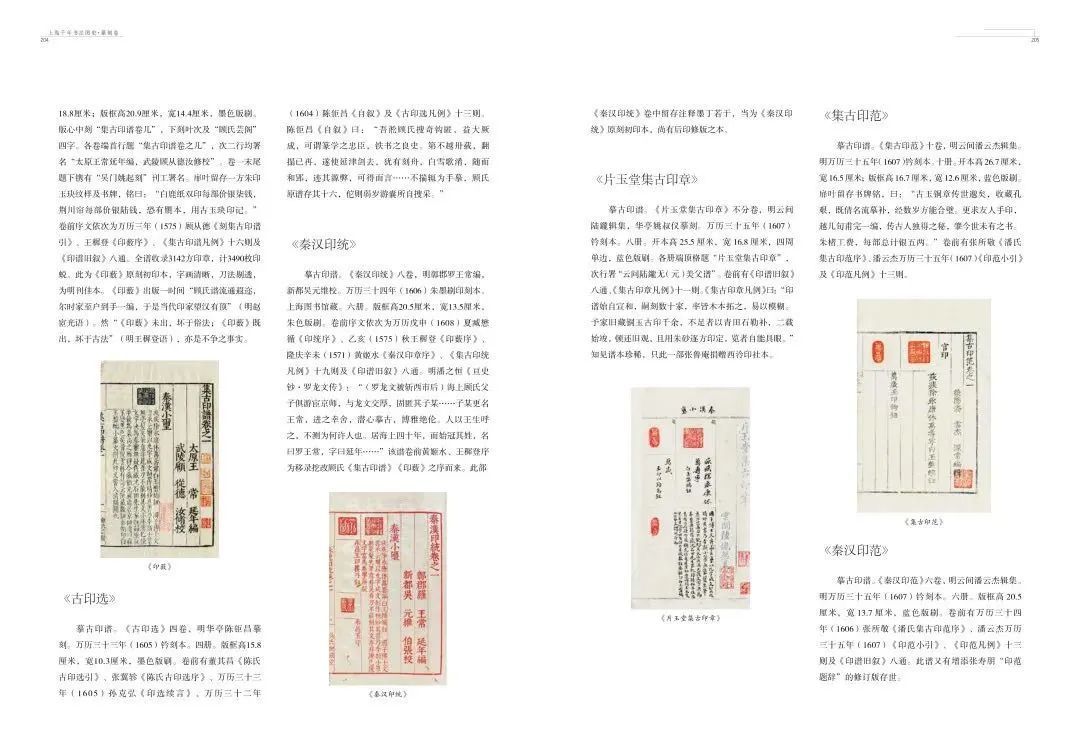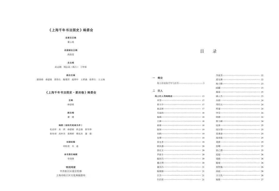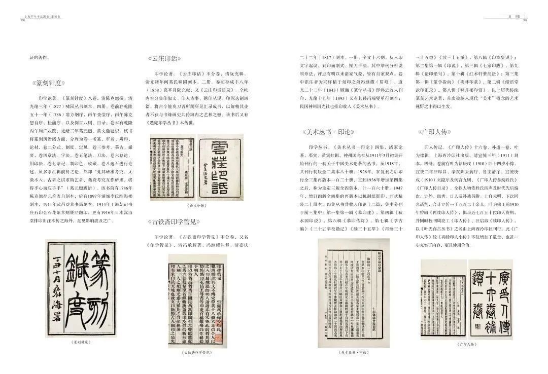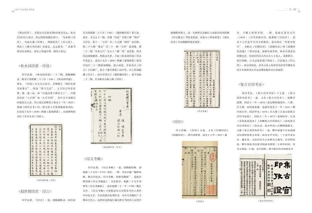 《上海千年书法图史》(篆刻卷)即是对上海千年书法史中篆刻部分的综合考察,全书分概论、印人、印谱、印论、印著、印赏、印事、附录八个部分,以图文相融、以图看史的体例呈现上海千年来篆刻艺术以及相关文化系统孕育、发展、繁盛的历程与概貌。本书的主要特点即是以丰富的图版配以充实的历史文献,整体呈现上海千年来的篆刻文化,部分图版亦为首次公开出版,具有重要的学术意义。