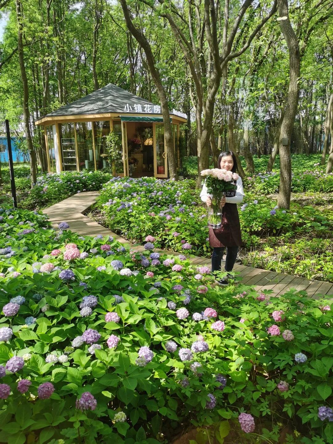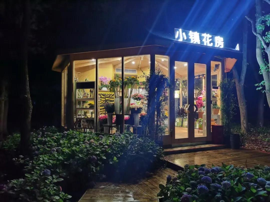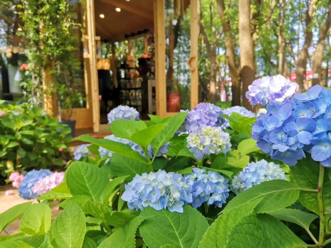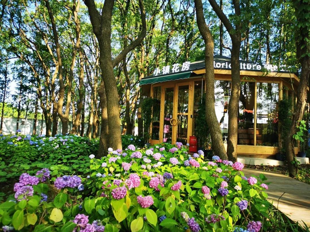 小镇花房处于花博邨香樟林中,一条木栈小道,两旁绣球花带,三五声虫鸣鸟叫。还可落座于窗前小桌,赏精品鲜花,观蝴蝶嬉戏,是闹市中难得的清净。