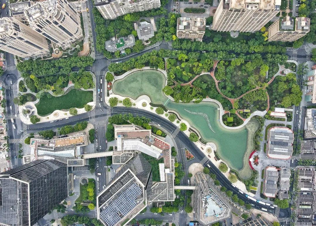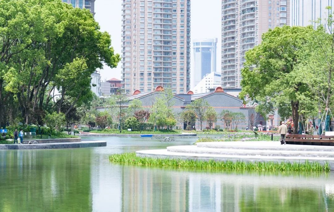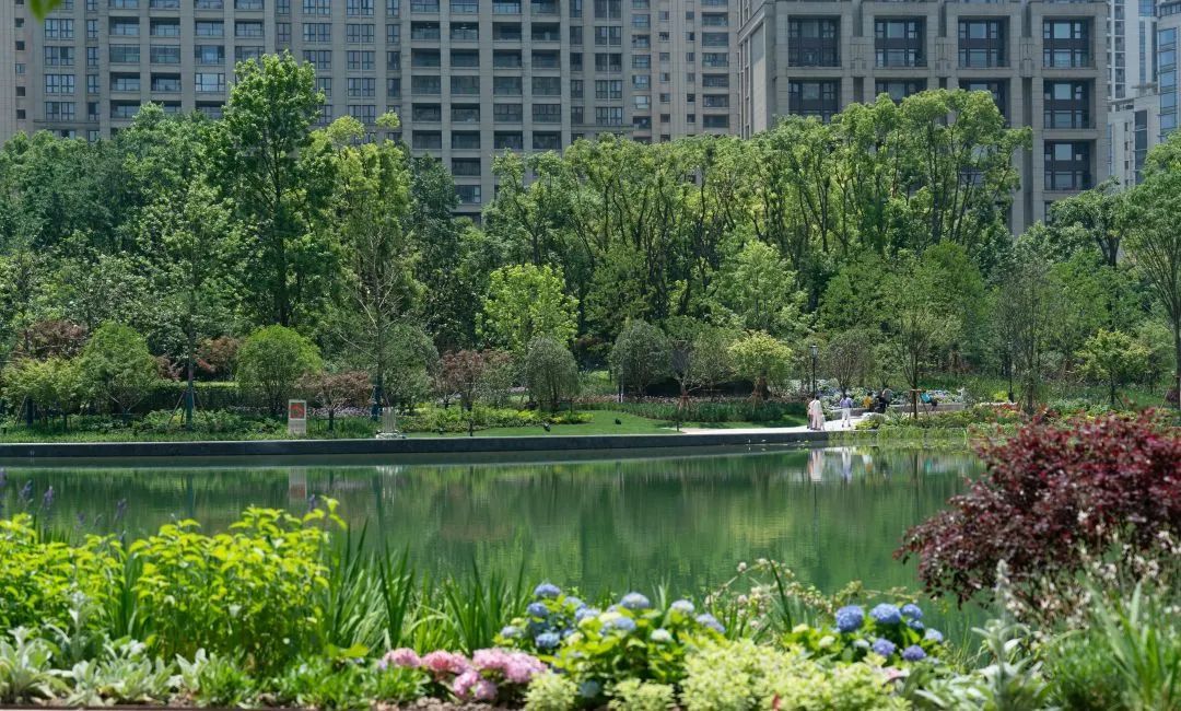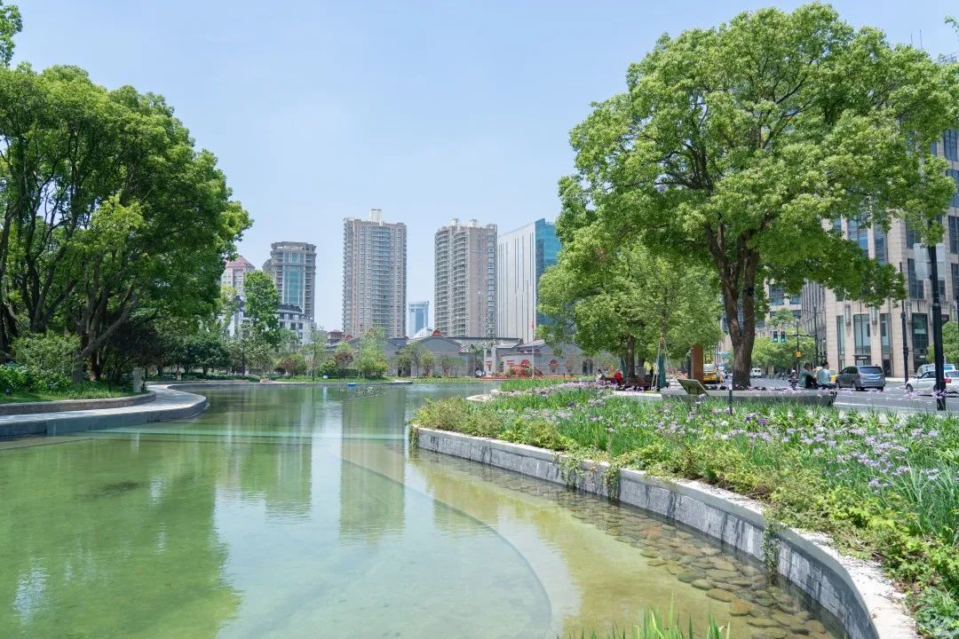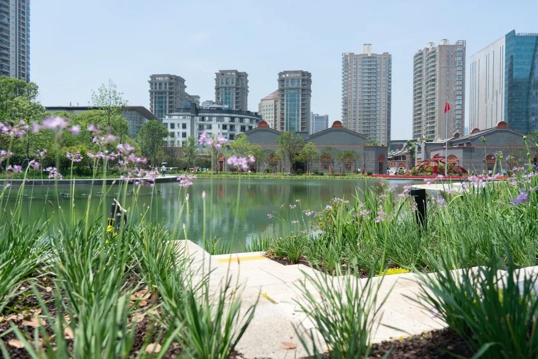 ▲太平湖位于太平桥绿地的中心位置,岸线蜿蜒灵动,给予市民亲水观光的享受。改造过程中,湖畔种植了鸢尾、红莲、千屈菜、梭鱼草等丰富多彩的水生植物,岸边使用紫娇花、百子莲等植物打造多彩花境,并结合大花溲疏、常春藤等爬藤植物垂挂岸边,软化了驳岸,使太平湖更具自然生态、亲和灵动的魅力。
