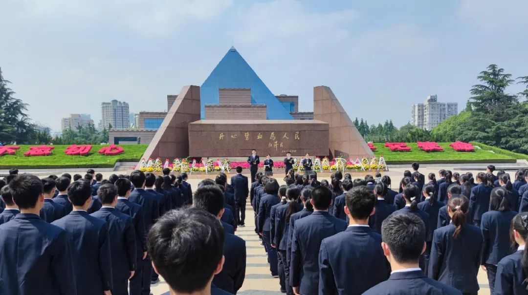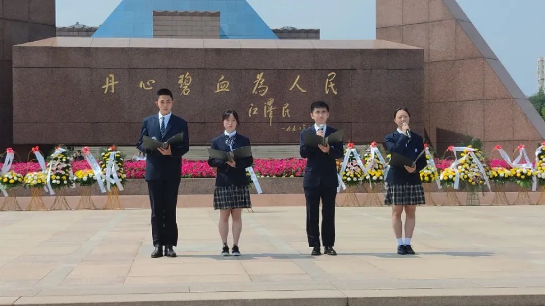 士兵踏着正步,在“丹心碧血为人民”的碑像前献上花篮,学生们穿戴整齐的西服集聚一堂,伴随着《国歌》和《国际歌》,在庄严肃穆的氛围中寄托哀思。高二学生带来以“继承先烈遗志,不负青年担当”为主题的原创诗朗诵,“吾将吾心献吾党,吾心归来是吾乡;立心立命开太平,利国利民兴家邦。”充满感情的朗诵咏叹出新时代青年的心声,他们将继承先烈遗志的初心,坚定实现中华民族伟大复兴的梦想。仪式后,学生们还参观了陵园内的展区。
