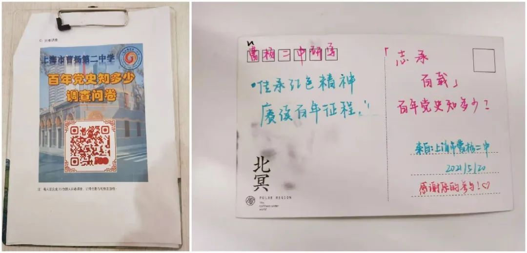 “您好,我们是曹杨二中的学生,可以抽空帮助我们完成一下调研问卷吗?”马一茗和组员特意准备了明信片,对参与问卷调查的路人表达谢意。颇为意外的是,马一茗小组偶遇了前来展馆参观的一个老党员团队,他们欣然接受学生的邀请,不仅认真填写问卷,还结合自身经历向学生们讲述对党的感情。“那一刻,我和同学们都被老党员的热情和爱国情怀深深感染了。”马一茗表示,“从参观展馆到问卷调查,这次活动让我们从理论联系实际,对党史学习教育的体会更深切了。”