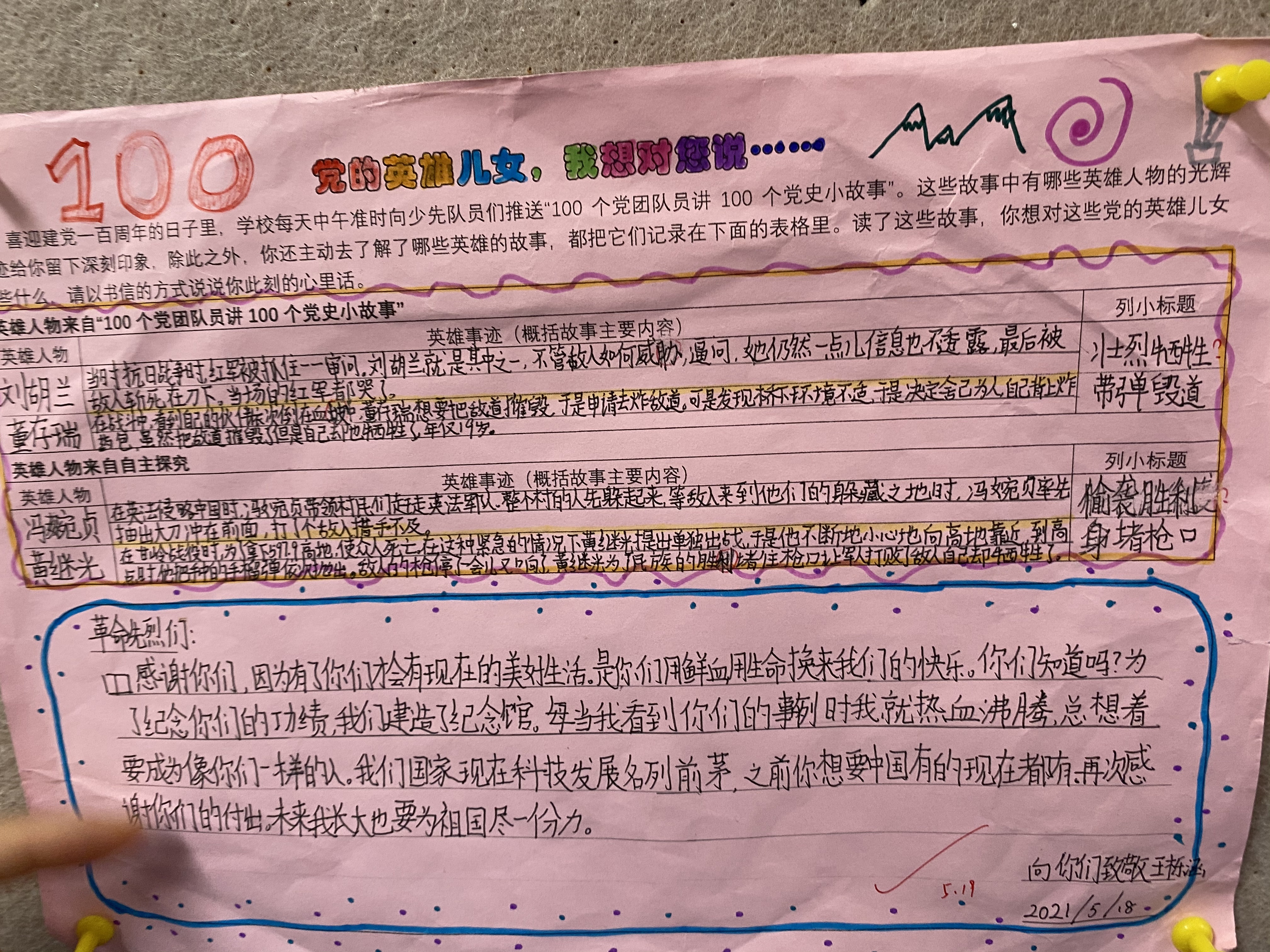 “100个党团队员同讲100个党史小故事”,自今年3月起,学校每天中午都会向全体学生广播一个由党团员带领队员共同讲述的党史小故事,两个月以来,已经“吸粉”无数。看到孩子们聚精会神地听着一个个党史小故事,语文老师袁萍在设计主题作业时有了灵感:结合当下单元教学目标,引导学生读懂并概括英雄人物故事,鼓励他们以真情实感给英雄写一封书信。