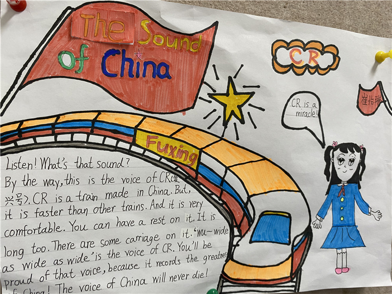 “Listen!It’s the voice of China.”(听!这是中国的声音)借鉴牛津教材第三单元第一课《Sounds》(声音),四1班英语老师吴凝寒启发孩子们去收集发现,百年来在党的带领下,我们国家发出的铿锵有力的声音。于是,主题作业展上便传出了令人自豪的“中国之声”:高铁的声音、航天的声音、体育赛事争金夺银的声音……在同学们的眼里,这些都是世界上最悦耳动听、最振奋人心的声音。