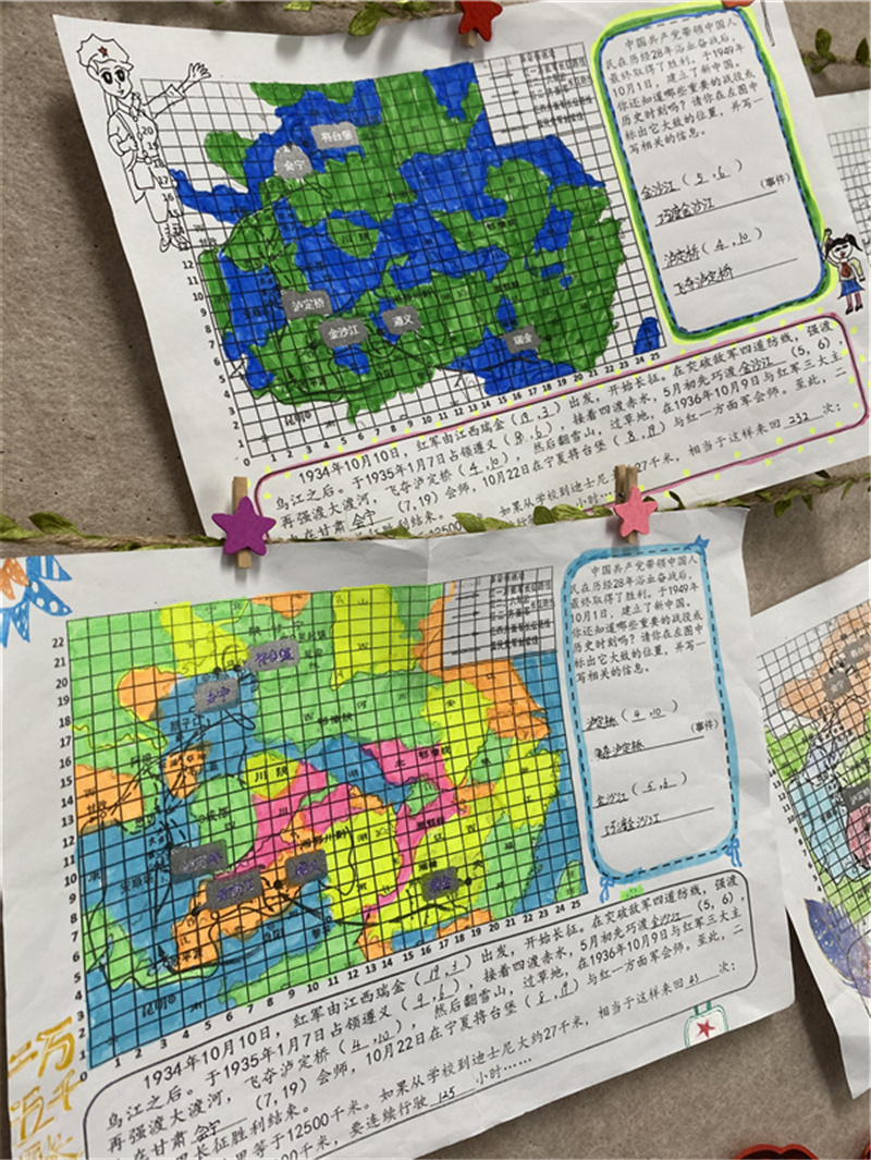 刚教完“数对”的知识,四1班数学老师张颖就引导学生把数学学科里的“数对”“数轴”等内容与长征路线图融会贯通:“遵义会议”“巧渡金沙江”“飞夺泸定桥”……在标注“数对”位置并填写信息的过程中,同学们也更了解了红军长征中的重要战役和历史时刻。