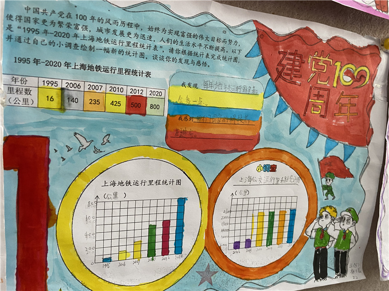 在三5班,刚刚学了“条形统计图”的同学们,又迷上了数学老师庄慧文设计的“1995-2020年上海地铁运行里程统计”。在一张张柱状图前,同学们直观地感受到城市建设的日新月异,并在开放式调查版块,填上了“上海GDP统计图”“中国运载火箭发射统计图”……