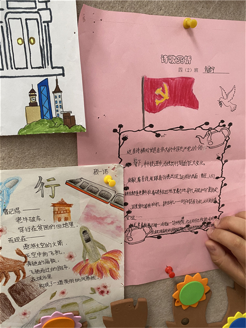 在这次主题作业展中,四2班和四4班还别出心裁地展开了合作:4班的同学写诗,2班的同学评点。“曾记得——老牛破车,穿行在贫困的田地里,而现在——遨游太空的火箭,奔驰的高铁,在城市里构成了一道美丽的风景线。”顾一诺的这首诗,在钱皓宇眼前,展现出了一幅国家科技进步的美妙画卷:“这首诗运用了比较的手法,突出了现在社会科技迅速发展和人们出行方式的巨大革新,让人眼前一亮。”