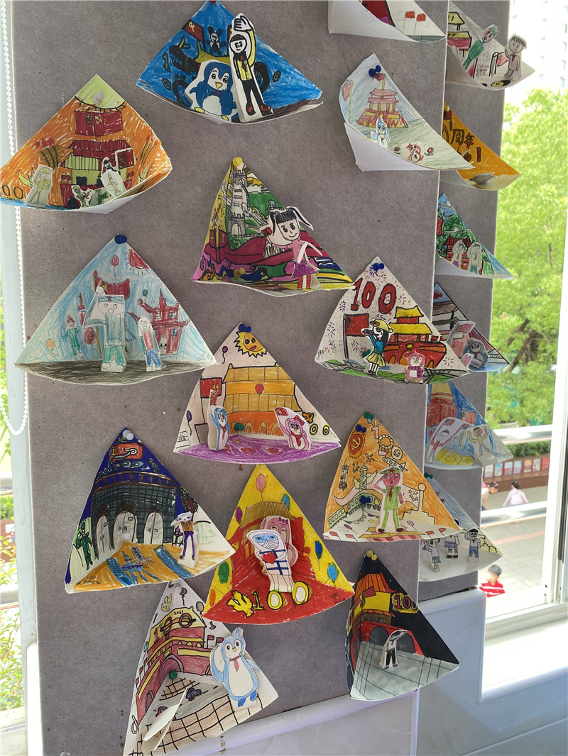 令孩子们赞叹的,还不仅仅是诗文。这些天,美术老师王慧正忙着和孩子们一起布展,他们把一张正方形铅画纸,折叠粘贴起来,呈现一个个半立体的“红色舞台”。在“舞台”上,有抗疫英雄,有红军战士,还有蓬二的吉祥物“蓬蓬”和“莱莱”……