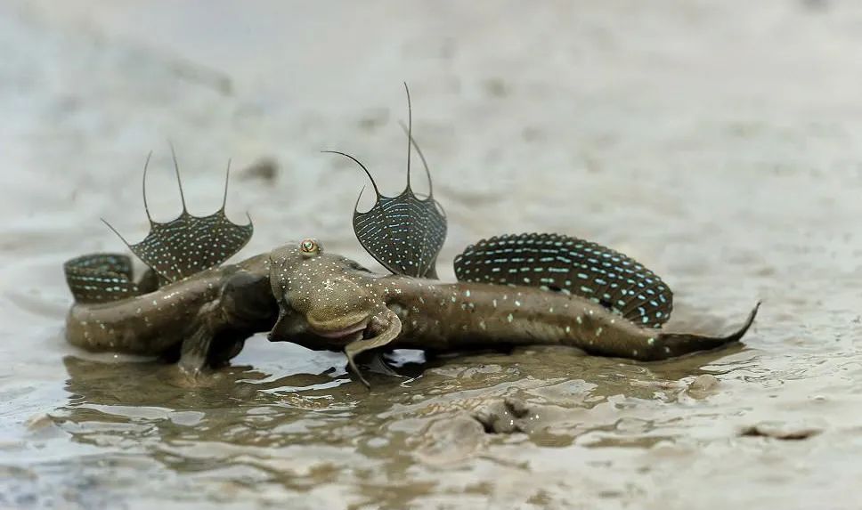 湿润绵软的滩涂上,弹涂鱼一改鱼类的水生常态,近乎疯狂地爬行弹跳,看起来就像是爬出深井的小青蛙一样可爱欢快。正因如此,它们才获得了“跳跳鱼”的别称。作为从海洋爬向陆地的典型生物,弹涂鱼强劲有力的肌肉让它们拥有了沙滩跳远和跳高运动员的美誉。