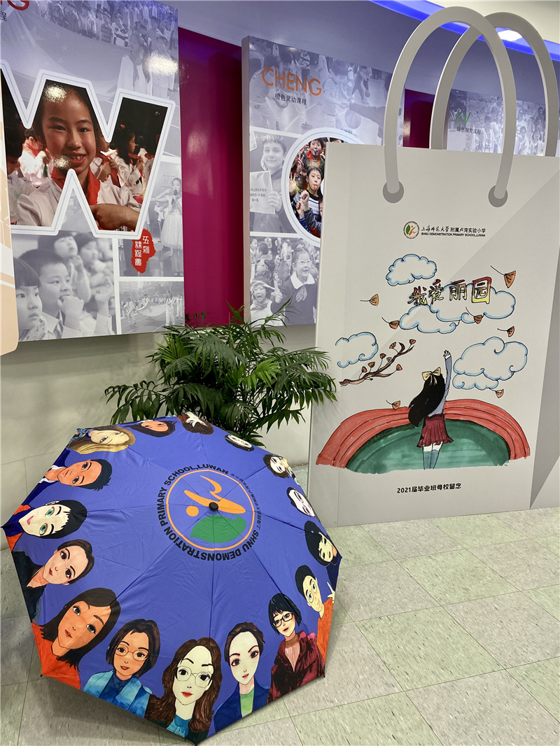这是五年级学生设计的晴雨伞,印有老师们的卡通肖像,寓意着“为丽园学子遮风挡雨的园丁”