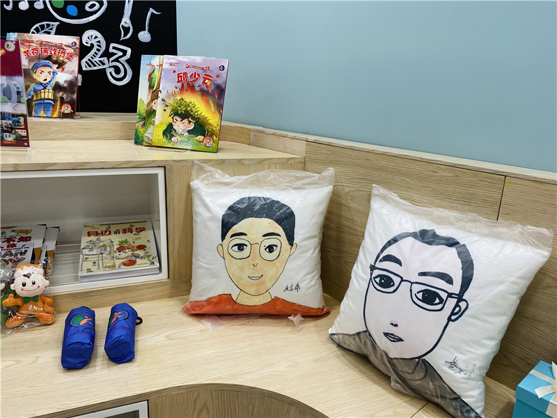 校信息技术和数学老师的卡通肖像生动地呈现在靠枕上