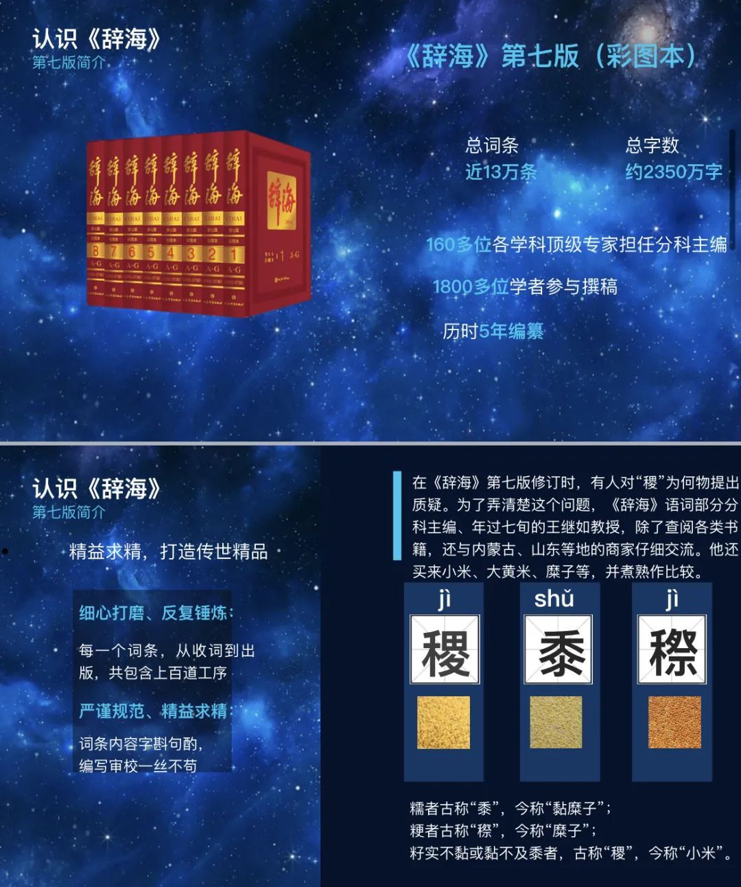 由上海世纪出版集团、上海辞书出版社开发建设的《辞海》(第七版)网络版,收录了《辞海》(第七版)近13万词条、2350万字全部内容,并丰富数字检索方式,建立词条关联和构建多层知识导图,新增词目注音和人声配音、汉字规范笔顺及源流、书法,形成了一款在电脑、手机等设备上随时随地可以查阅,融合音视频、图像和三维立体模型的有声、有色、有形的立体“辞书”,无论结构还是功能,都充分体现了数字产品的特点和优势。