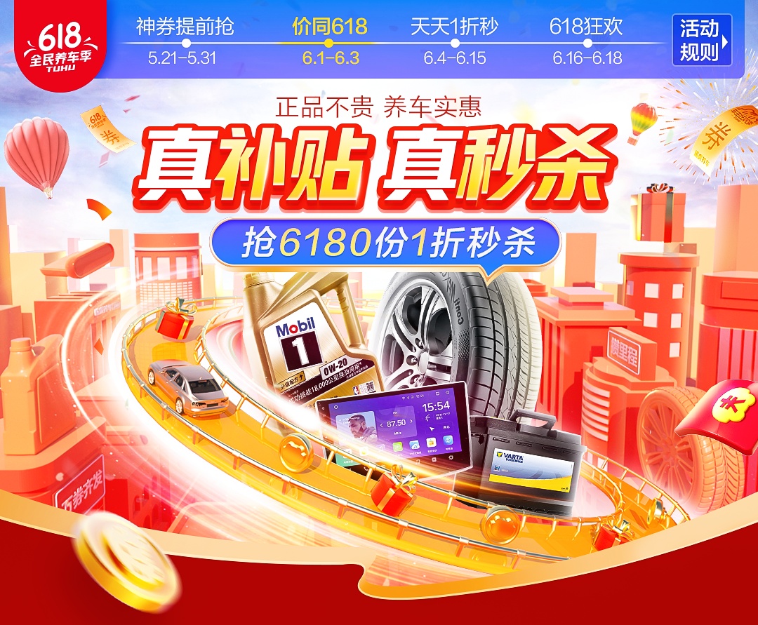 买了新车,您不用担心如何养车。途虎618全民养车季为您提供正品不贵的养车实惠,主打真补贴、真实惠活动。