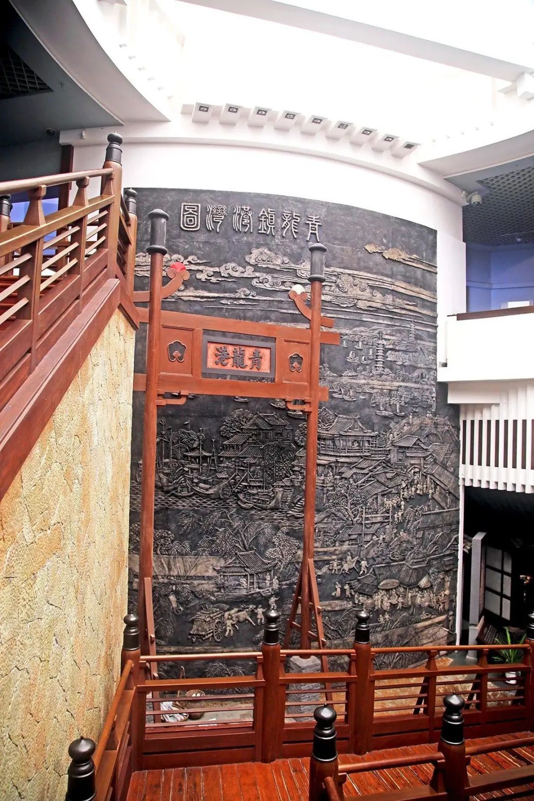 进入水文化馆,人们可通过“沧海桑田”来了解历史上青浦的水系变迁、建置沿革。青龙镇港湾实景复原区气势恢弘,再现了宋代海外贸易港口青龙镇的市井风情和繁华景象。“桥文化”“水乡风情”等板块,则展示了水乡动人的风情、旖旎的风光。“人杰地灵”展现了青浦从古至今的深厚文脉。