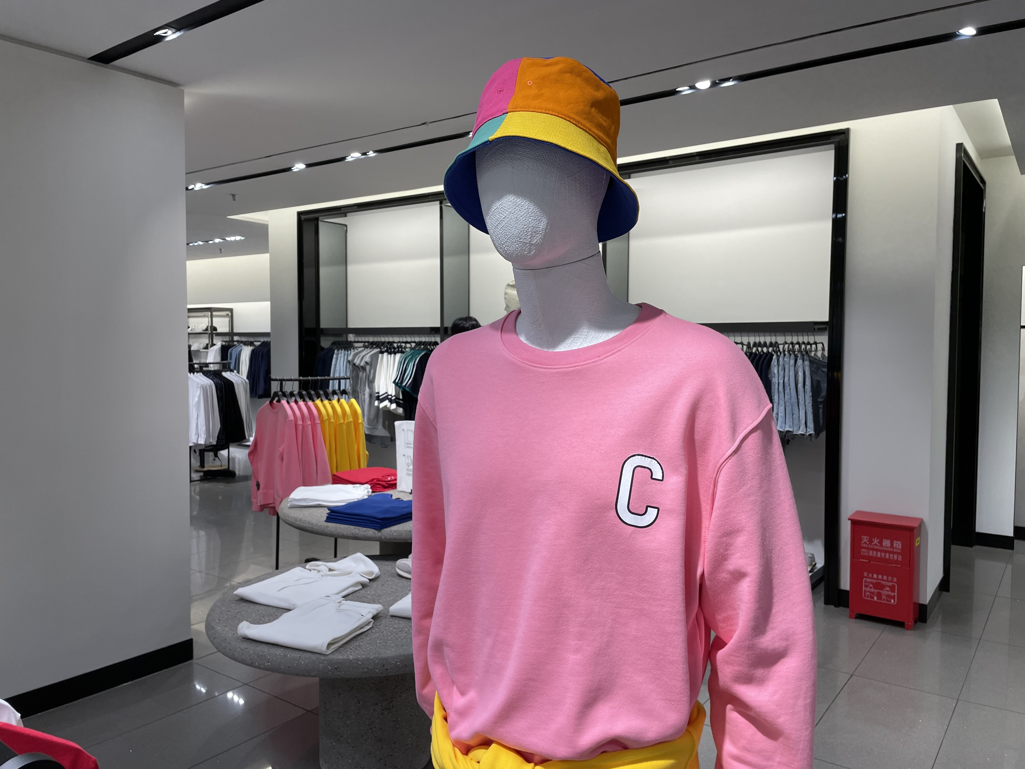 在南京东路旗舰店内,记者在三楼男装区域看到,十余种不同颜色的三款 T 恤、polo 衫和运动衫,供顾客选择。