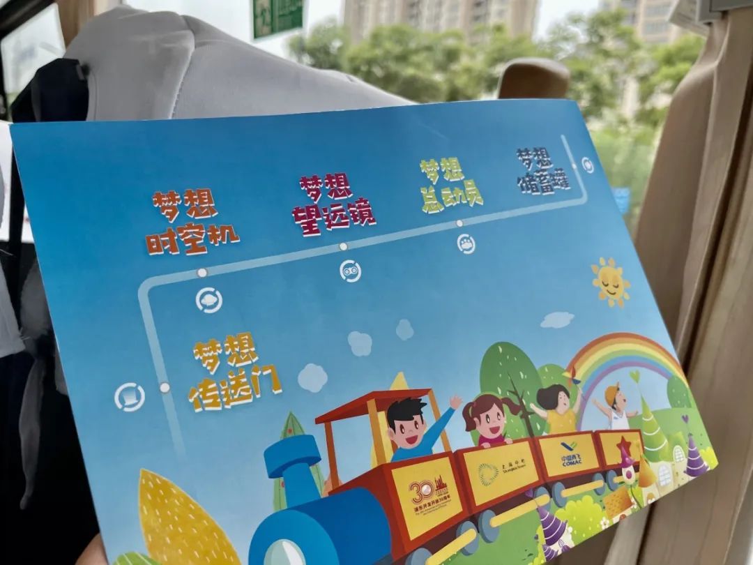 正午的阳光颇为强烈,但志愿者们依旧整装待发,在地铁站口等待孩子们到来,并引导他们前往浦东展览馆现场。在浦东展览馆外的启动仪式现场,孩子们伴随着欢快的音乐,踏上梦想红毯、穿过梦想之门,最终在名为“梦想储蓄罐”的愿望板上写下了自己的梦想。仪式上,他们又收到了一张“梦想车票”,并以此登上“浦东梦想之旅”的列车。