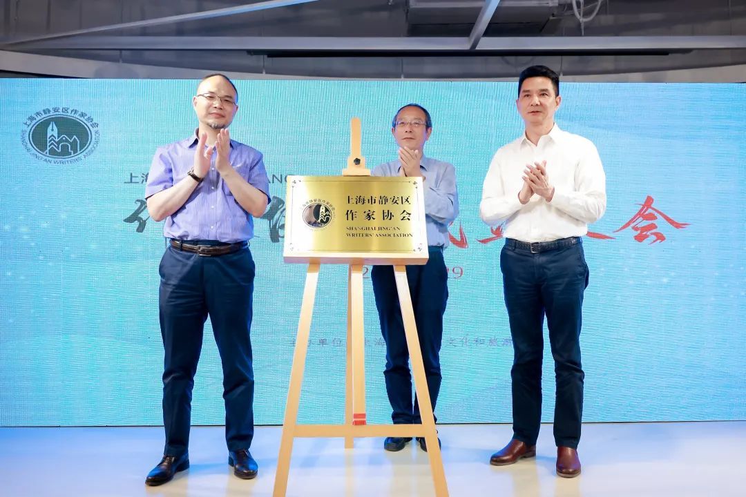 上海市作家协会党组书记、副主席王伟(中)、中共静安区委常委、宣传部部长姜鸣(右)、上海市图书馆副馆长林峻(左)共同为静安区作家协会揭牌。