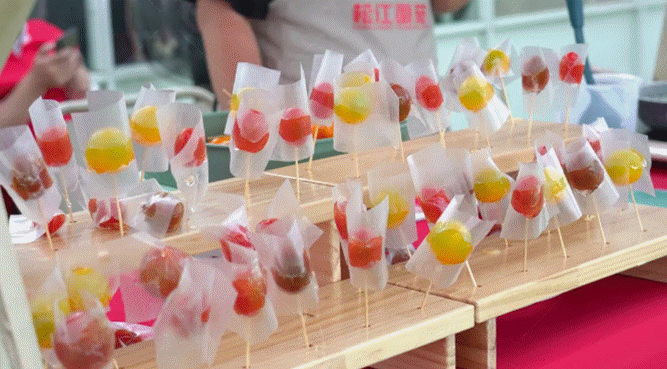 在旁边的餐车前,制作小番茄糖葫芦、冰淇淋、鲜榨小番茄汁、西瓜汁、五彩色拉等一系列以小番茄和西瓜为原材料的手工活动吸引了许多亲子家庭前来体验。