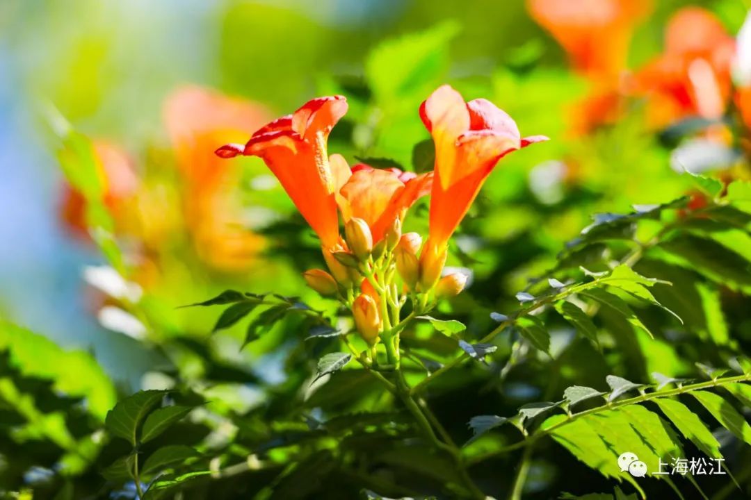 初夏,松江正是满眼的绿色。可就在这绿叶丛中,偏偏探出几朵艳丽的花。乍一看,像是喇叭花;仔细一瞧,原来是《致橡树》中“攀援的凌霄花”。