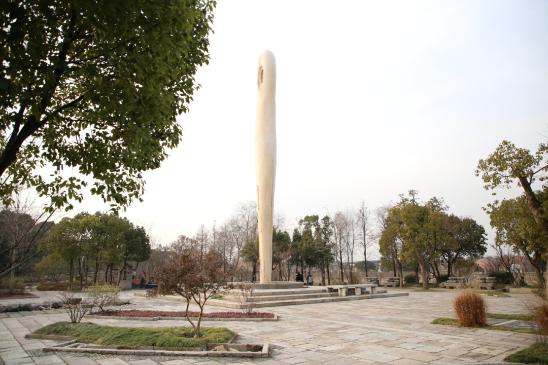 在阙门进入后中轴线的尽头有一个广富林文化遗址的核心地标——骨针广场。中间竖立着一根象征先人编制衣被渔网的工具——骨针,这是广富林发掘出来的代表性遗迹。骨针作为广富林室外展区的地标,既代表了广富林文化遗址时光的久远,也象征了广富林先人的智慧与勤劳,并提示参观者已经到了广富林遗址核心保护区的边缘。