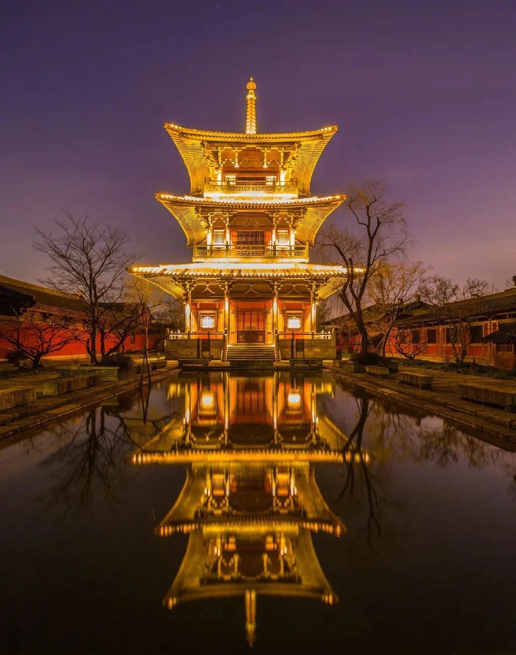 庭院的长廊古朴幽静,雕花的木门上依着精致的灯笼。庭院中央,碧波与倒影,如梦如幻。