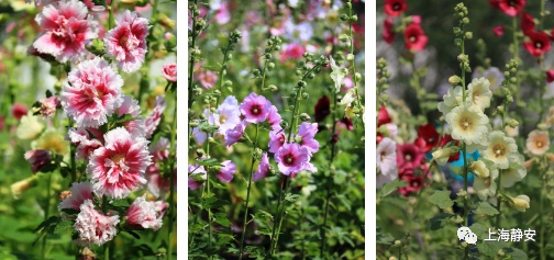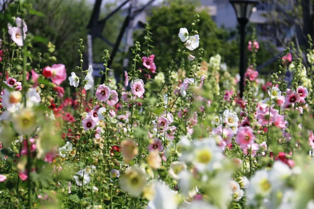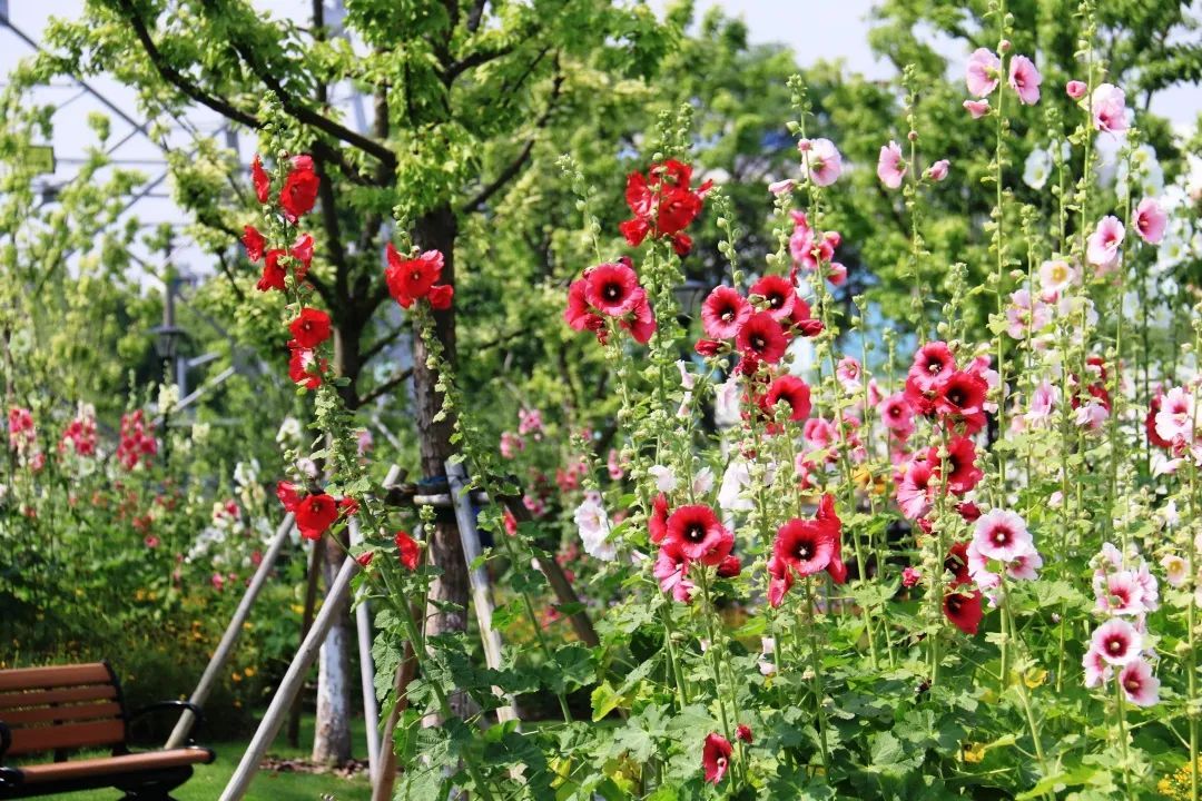 进入春园,穿过廊架,便可以看见一大片漂亮的蜀葵。蜀葵,别称一丈红、戎葵等,花期2-8月。由于它原产于中国四川,故名曰“蜀葵”。