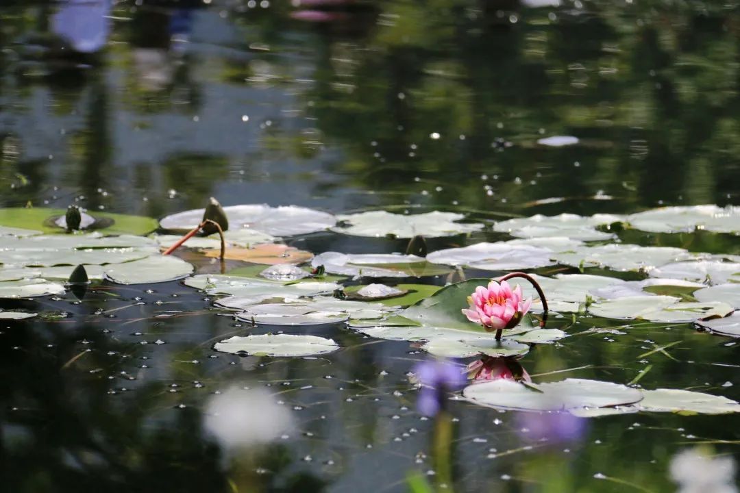 进入夏园,喷泉池边梭鱼草映衬着池中的莲花,两三尾小鱼悠游水中,岁月静好。
