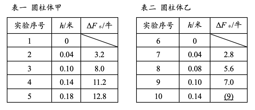 为了研究圆柱体在浸入水的过程中,水对柱形容器底部的压力增加量ΔF水的变化情况,某小组同学使两个体积相同、底面积分别为S甲和S乙(S甲>S乙)的实心金属圆柱体分别在同一柱形容器的水中缓慢下降,如图所示。他们设法测得水面到柱体下表面的距离h并计算相应水对容器底部的压力增加量ΔF水,将相关数据记录在表一、表二中。(容器内的水均未溢出)