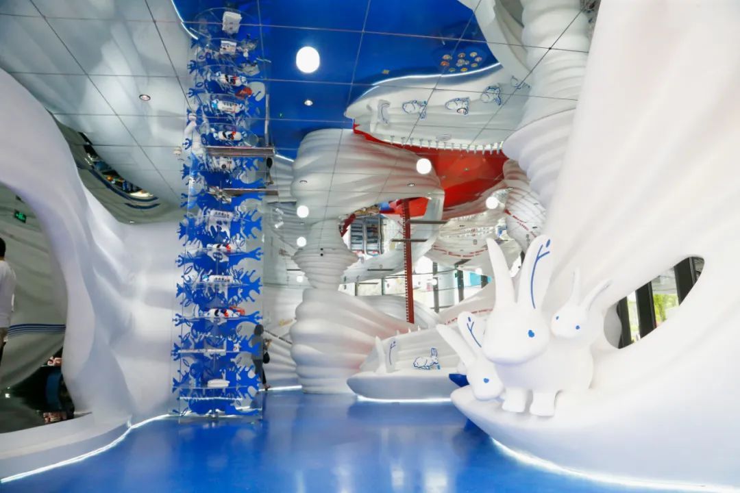 在奉贤,一直流传一句名言,“人民让城市伟大、企业让城市强大、文化让城市高大”。作为让城市强大的“亲密伙伴”,此次,大白兔全球首店开业,就给这座城市带来了不一样的视觉冲击。记者在位于奉贤新城的九棵树(上海)未来艺术中心内,见到了这家集销售、展示、体验为一体的大白兔全球首店。虽说是“店”,但更像一个小型“艺术展示馆”。200余平方米的空间内,整体配色不仅使用了大白兔品牌特有的“红、白、蓝”三色,进一步加深了视觉冲击力与品牌印象,在空间造型上更引用了3D打印技术模拟出了牛奶的流动感,将产品与陈列设计完美融合,整体空间突出叙事性,让每一位进入到店内的消费者,如同踏入一场沉浸式的展览,游走在品牌呈现的故事中,成为参与者。大白兔首店主持设计者李想透露,大白兔九棵树全球首店既保留了大白兔的品牌精髓,又体现出品牌不断突破、寻求创意融合的新锐态度。这也与九棵树(上海)未来艺术中心的商业愿景——打造未来艺术中心的想法不谋而合。