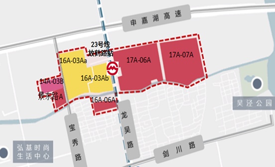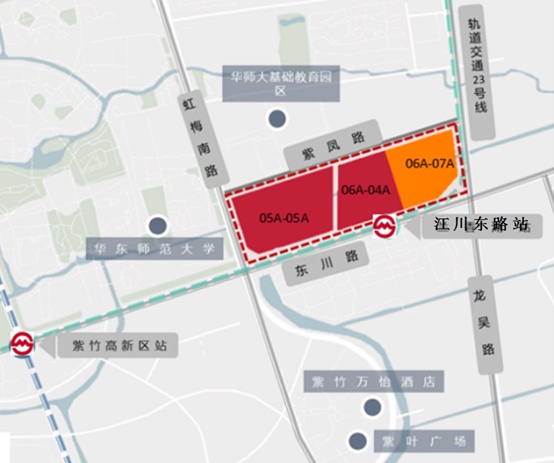 位于东川路以北,虹梅南路与龙吴路之间,距离23号线江川东路站50米,占地约278亩,两块规划为商业商办,一块规划为研发用地。