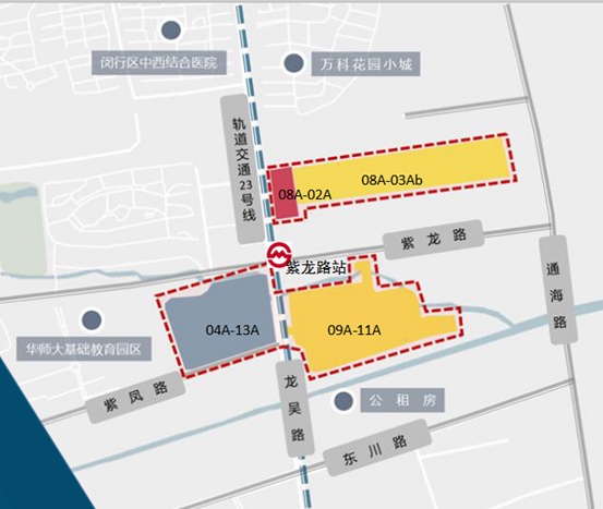 位于龙吴路、紫龙路周边,紧邻华师大基础教育基地,23号线紫龙路站位于区域中央,到各地块的距离均不超过200米,规划有商业商办、普通住宅及医疗卫生用地。