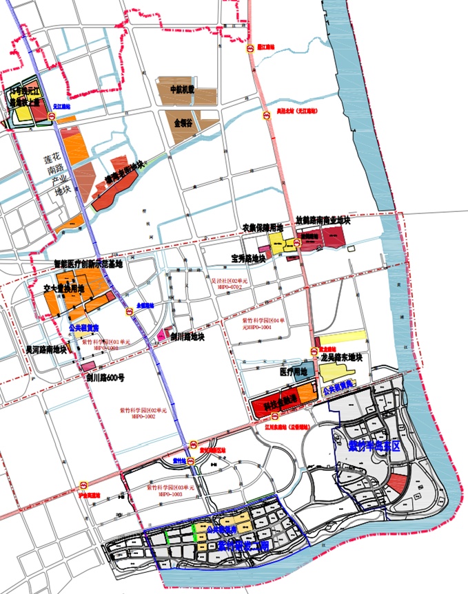 位于江川东路以南,莲花南路两侧,距离15号线紫竹高新区站约1.3公里,总占地面积2000亩,总建设用地面积960亩,规划性质以研发为主,包含一定体量的工业、商业及住宅。