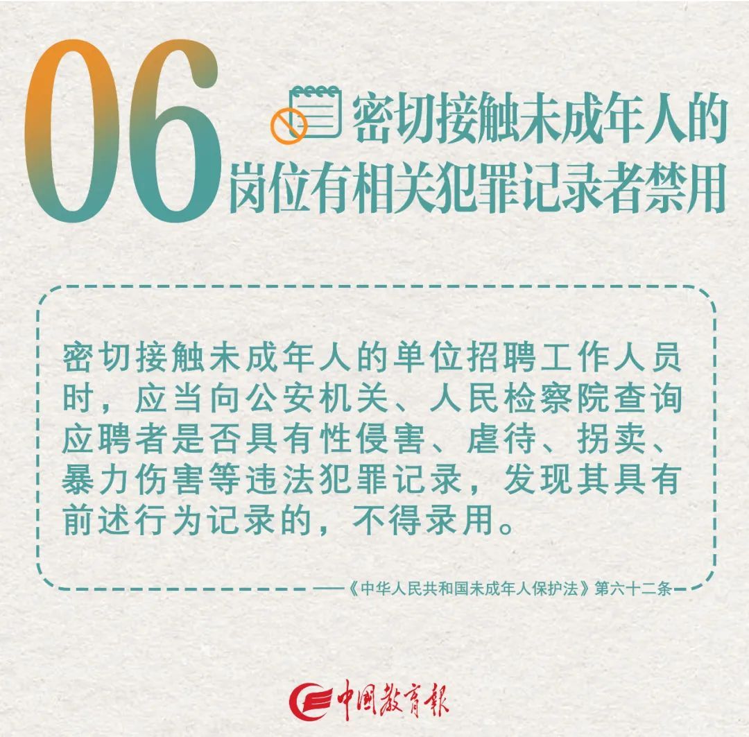 比如“在教育、管理中不得使用任何贬损、侮辱学生及其家长或者所属特定群体的言行、方式。”“除因法定事由,不得查阅学生的信件、日记、电子邮件或者其他网络通讯内容。”“因虐待、性骚扰、体罚或者侮辱学生等情形被开除或者解聘的人员不得聘用”等。