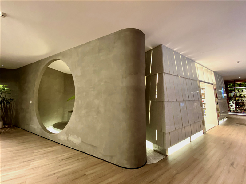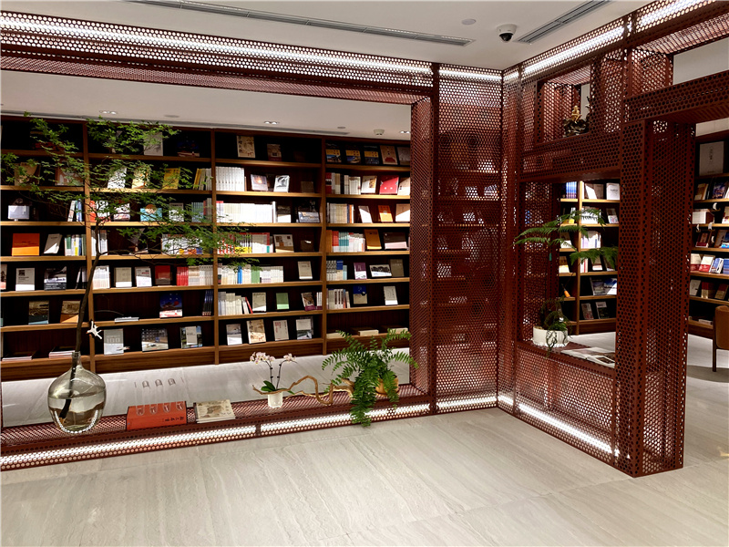 穿过书架和隔墙,读者会来到书店的主要空间,也就是大酉山的内部。大酉山并不是真实存在,而是由酒红色穿孔铝板形成的洞口,以及书架形成的各种可以坐下来的角落和空间组成,做到了处处有惊喜,步步有景。