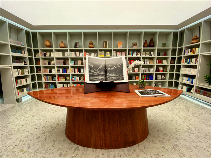 大酉山的主空间分为阅览区和生活区。生活区有个圆弧形长桌,可以有摆放咖啡,茶,酒,阅读,香道,花道,盆景以及吃几口的闲适心情。此外,大酉山还可以举办展览和路演,还有无处不在的鲜花点缀在洞口,书架,吧台,书桌甚至书店门口。