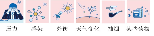 银屑病是由内外因素共同作用引起的。内因包括患者的遗传背景,免疫状况,内分泌等因素。外因有压力、感染、外伤、天气变化、抽烟、某些药物等因素。