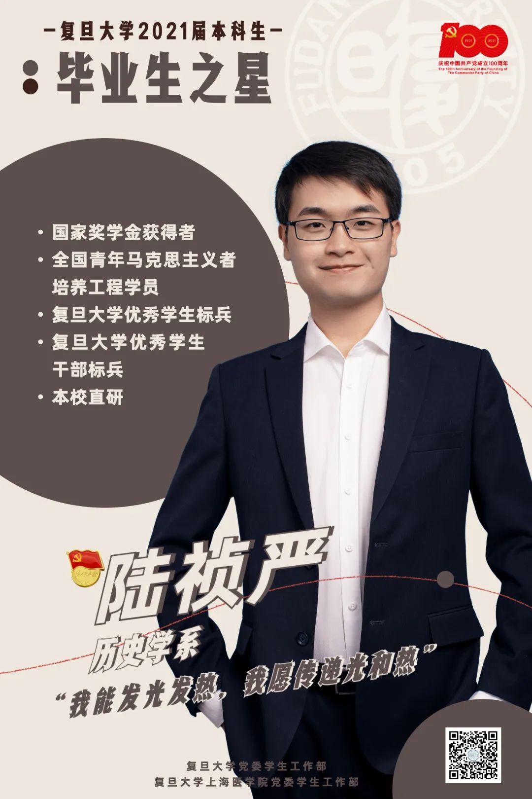 陆祯严曾三年综合考评专业第一,八次荣获各级各类奖学金,获“莙政学者”称号。他历任班级、院系、学校主要学生骨干,入选全国青马工程、大学生实习“扬帆计划”。疫情期间,他作为党员,牵头系列讲座,开辟谣言版块,参与发起“鹅旦梦”服务计划,把抗疫阵地从后方延伸至前方。他发挥专业所长,在央视“云游中国”节目中讲述复旦随祖国发展腾飞的故事,策划“近代中国‘文化三地’”实践,推动14个专业的百余名学生接力延续上海城市记忆。目前,陆祯严已入选复旦大学-巴黎高师人文硕士班,立志成为担当时代大任的“斜杠青年”。