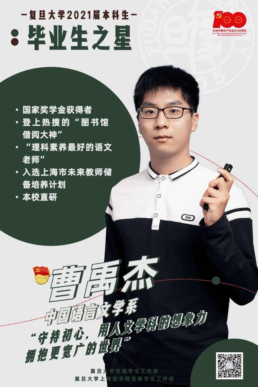 中文系的曹禹杰成绩优异,从高中起就立志成为一名语文教师。校内,他秉持复旦中文严谨笃实的学术传统,获评国家奖学金、复旦大学优秀学生标兵等多项荣誉。他连续三年担任新生班助理辅导员,累计为3个院系500余名新生答疑解惑,并积极投身包括复旦战“疫”医务子女线上辅导等20余项志愿活动;校外,他连续四年参与高中返校宣讲,累计引导52位南模中学学子进入复旦,与带教老师共同完成研究课题并在《语文学习》杂志上顺利发表。目前曹禹杰已入选上海市教委未来教师储备培养计划,未来他将在中国现当代文学专业继续深造,守持育人初心,探索人文未来。