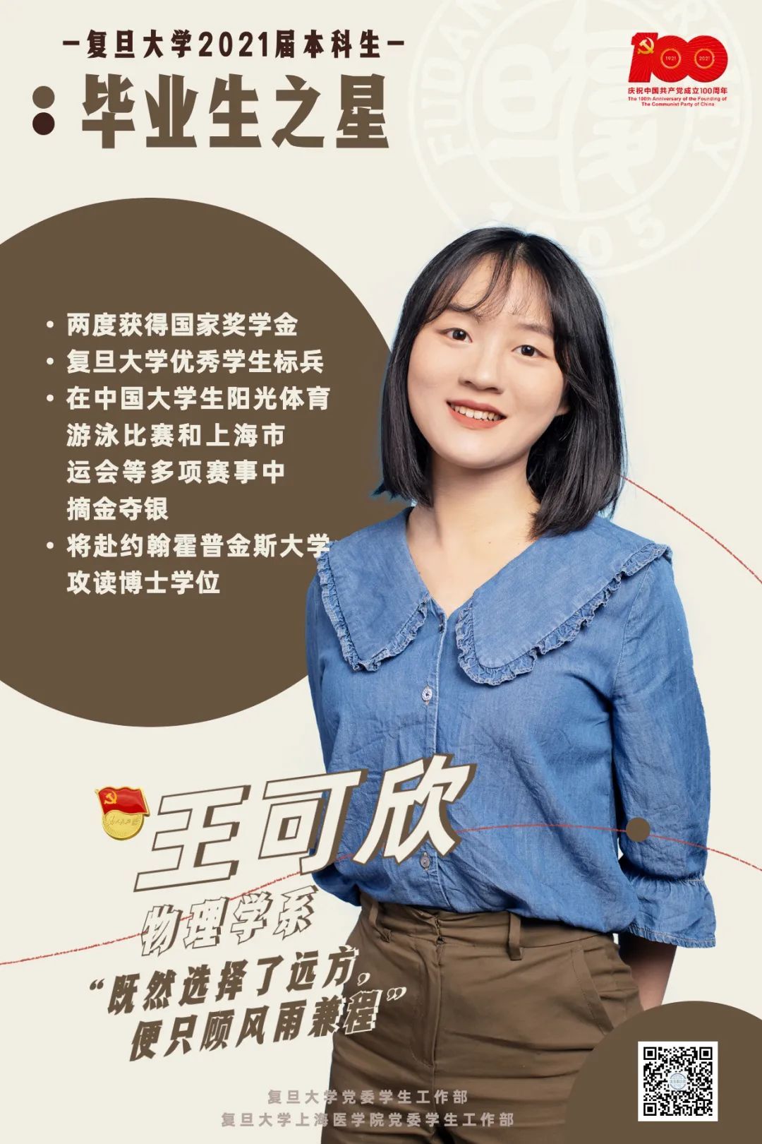 学习名列前茅,两度获得国家奖学金的王可欣因大一参加的启明星科创项目开启了学术探索之旅。在学术方面,她勇于探索,先后在多个方向开展了六段科研实践。作为“思源计划”六期成员,王可欣积极参与支教、社会走访考察等,疫情期间作为志愿者进行线上答疑,以实际行动担起新时代大学生的责任与使命。锤炼个人品质,立足全面发展,她以游泳和田径见长,在上海市运会、中国大学生阳光体育比赛中摘金夺银。未来,王可欣将赴海外攻读博士学位,不断探索科研道路,追求学术理想,立志为祖国健康事业贡献力量!