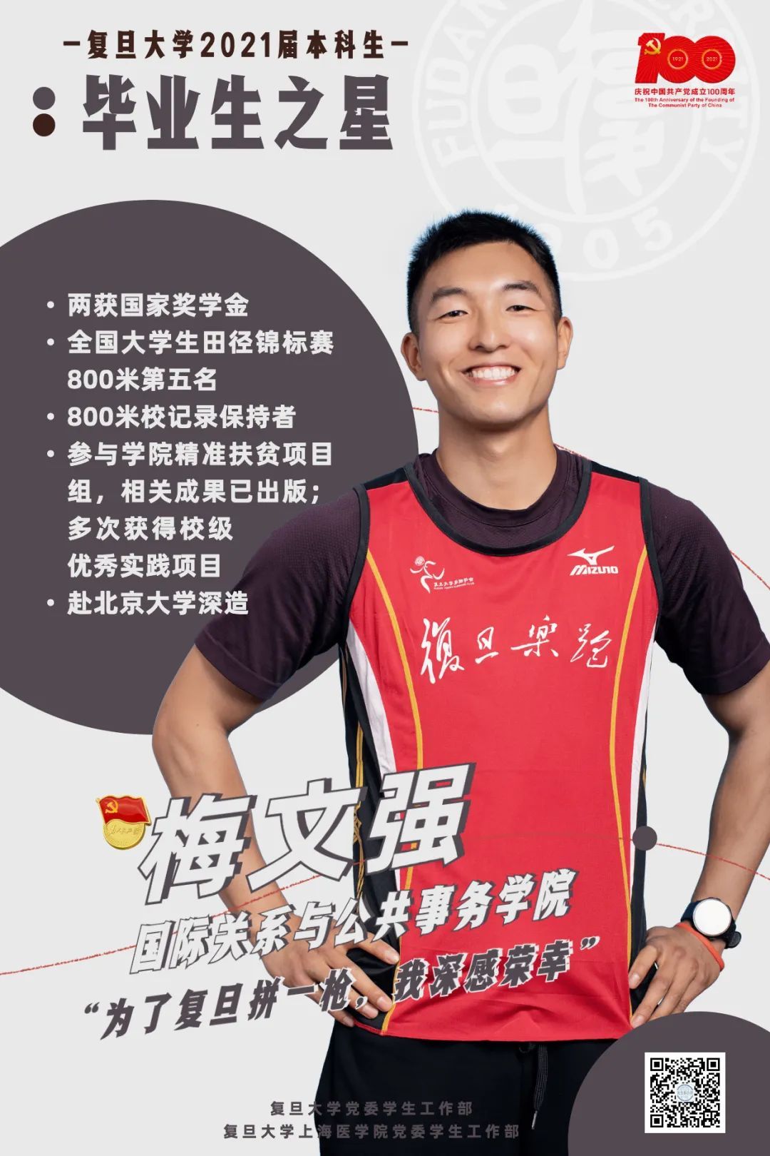 梅文强学习成绩优异,专业第二,两获国家奖学金等多种奖项。在同学眼中,梅文强是“学霸”和“体霸”的结合体。大学期间,国家二级运动员的他将学业与阳光体育相结合,代表学校参加省市级乃至国家级田径、手球与排球比赛,并屡获佳绩。其800米最好成绩达1:58.12,破复旦大学校记录,远超国家二级运动员标准,垄断近两年上海市800米与1500米冠军,在2019年全国大学生田径锦标赛中获得了第五名的佳绩。未来,梅文强将前往北京大学政府管理学院继续深造。